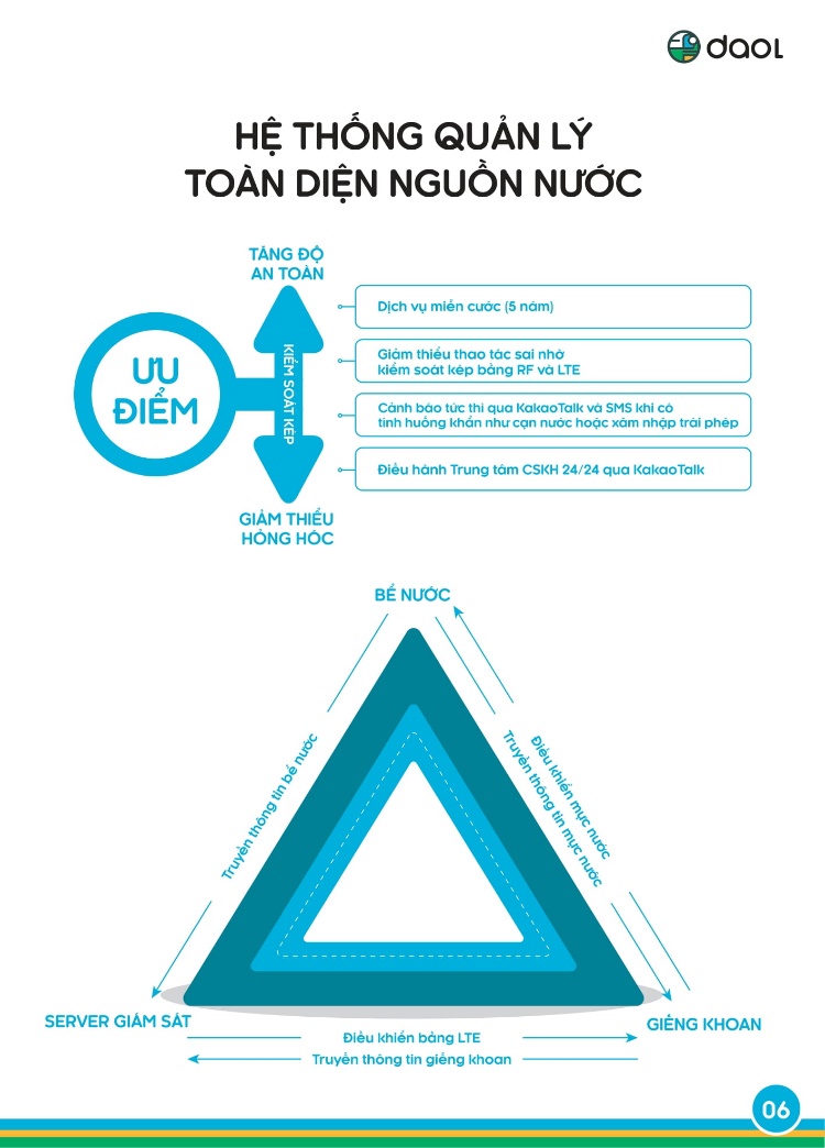 Hệ thống quan trắc nước ngầm của Daol tự động quản lý các công trình nước nhỏ lẻ trong khu vực, khi bể nước của người dân thiếu nước, hệ thống sẽ gửi tín hiệu đến giếng để tự động bơm nước và tự ngắt nước khi bể đầy. Ngoài ra, hệ thống còn có chức năng giám sát giúp theo dõi chất lượng nước theo thời gian thực qua web. Tin nhắn SMS cảnh báo sẽ được gửi đến giám sát viên trong trường hợp xảy ra sự cố. Bên cạnh đó, chất lượng của mạch nước ngầm và bể chứa nước cũng được theo dõi để đảm bảo cung cấp nước sạch và an toàn, đồng thời việc kiểm tra mực nước ngầm theo thời gian thực tế cũng giúp ngăn động cơ bị quá nhiệt và tăng tuổi thọ động cơ.