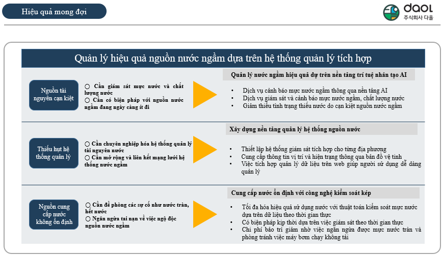 Hệ thống quản lý toàn diện nguồn nước của Daol là một hệ thống thông minh, đã được lắp đặt tại hơn 500 điểm khai thác nước ở Chungcheongnam-do, Hàn Quốc. Với việc lắp đặt thí điểm tại Việt Nam, công nghệ này hứa hẹn sẽ mang lại hiệu quả cao trong việc quản lý nước thông minh, góp phần tăng năng suất và chất lượng sản xuất nông nghiệp tại địa phương.