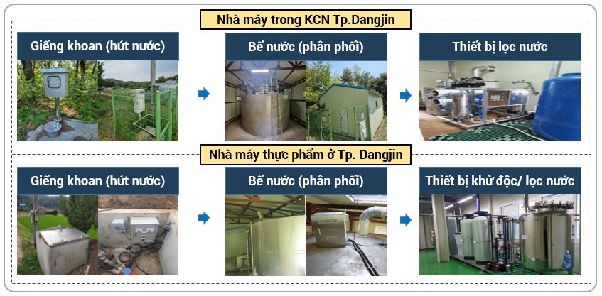 Hệ thống này đã được lắp đặt tại hơn 500 điểm khai thác nước tại tỉnh Chungnam, Hàn Quốc. Không chỉ ứng dụng để giám sát nguồn nước tưới tiêu trong nông nghiệp mà hệ thống còn được lặp đặt trong các nhà máy thực phẩm, điển hình là công trình giám sát nước ngầm phục vụ sản xuất kimchi tại thành phố Dangjin, tỉnh Chungnam. Chức năng chính của hệ thống là đảm bảo nguồn cung và chất lượng nước thông suốt trong toàn bộ quá trình vận hành nhà máy. Nguồn nước ngầm tại nhà máy trước khi đưa lên sử dụng trải qua đầy đủ quy trình khử trùng, lọc để phù hợp tiêu chuẩn của nhà sản xuất. Vì vị trí nhà máy đặt cạnh biển nên nguồn nước có thể bị nhiễm mặn bất cứ thời điểm nào, do đó hệ thống tập trung quản lý và dẫn truyền thông tin về độ PH, độ dẫn điện… của nguồn nước.